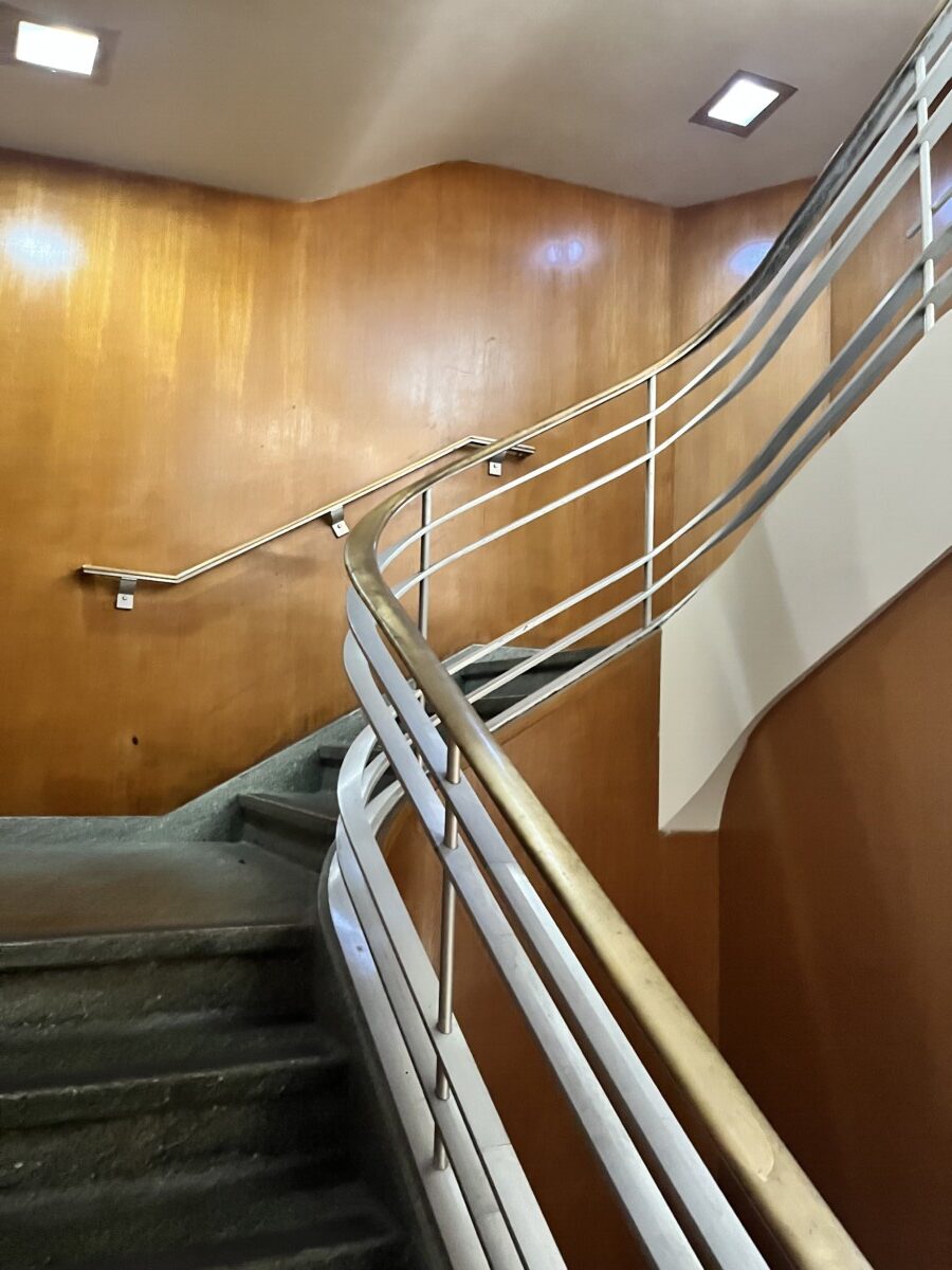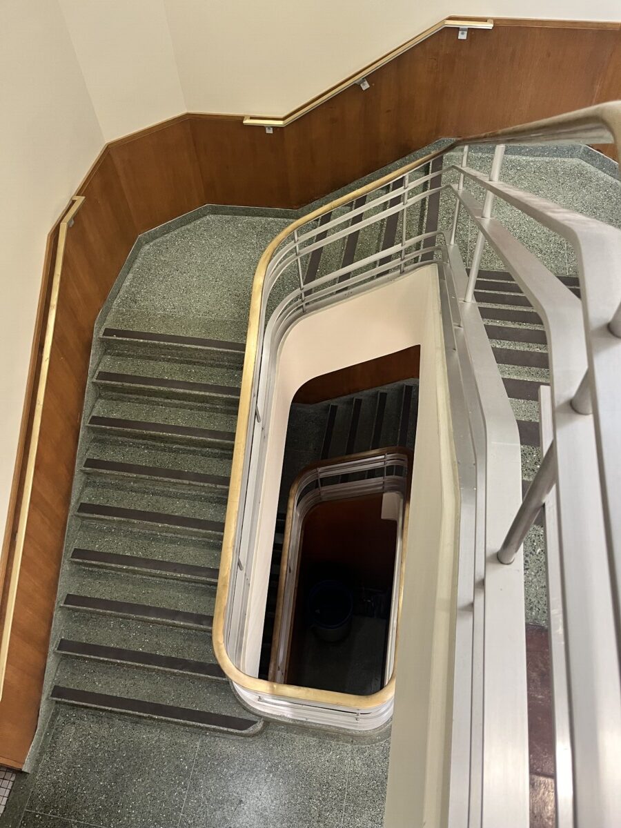 The current library was built in 1951. The style is vaguely deco, though. I like the warm walnut-toned walls and particularly the Streamline Moderne stair railings and terrazzo flooring. The ceilings are high but the space has an human, inviting feel to it.