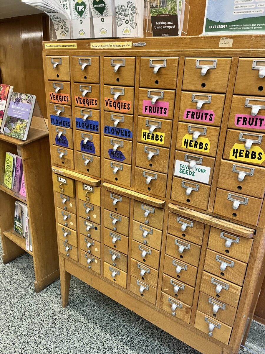 I was pleased to see the old school card catalog being used to index local newspaper articles. Near the entrance is another card catalog that now contains donated seeds.