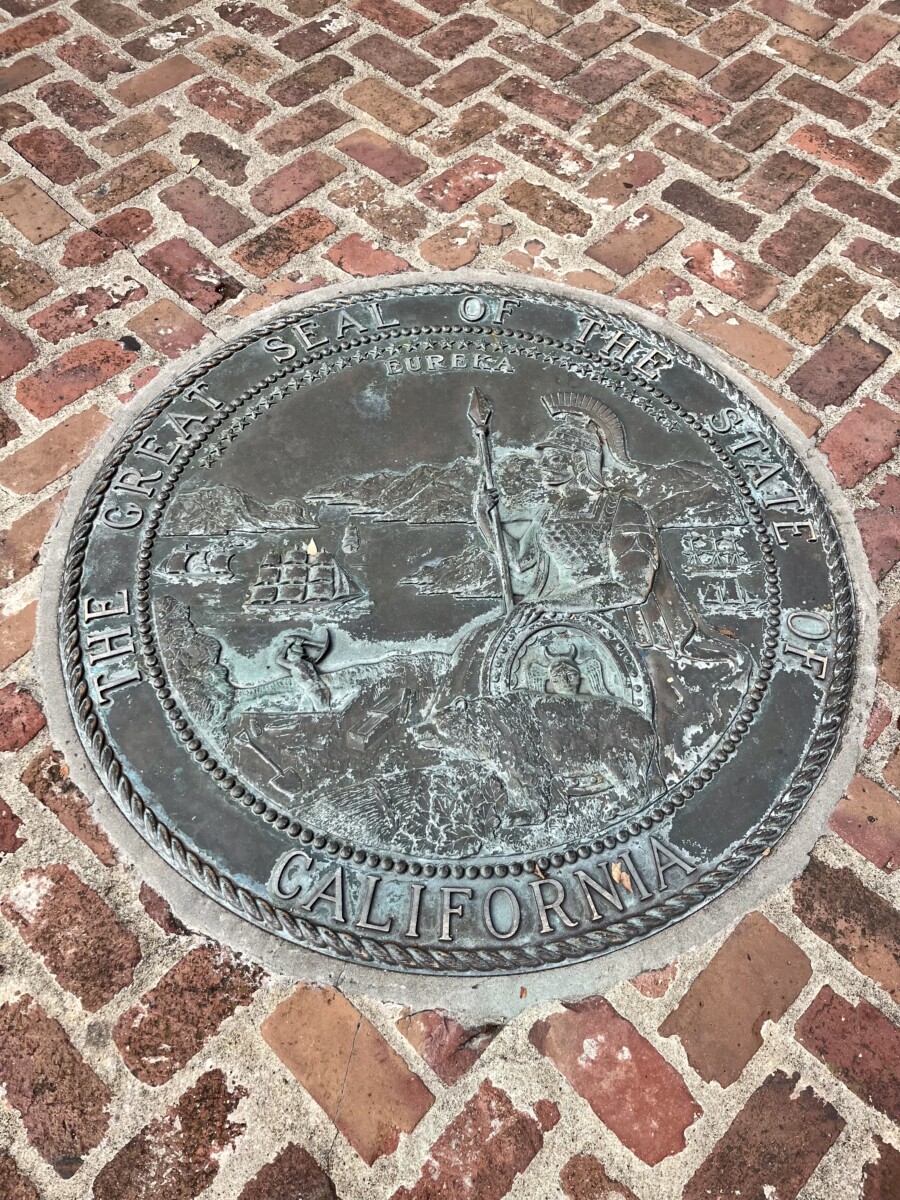 Documents to apply for statehood were composed at Colton Hall (named after the first mayor), which also was a school (museum was closed when I visited). This Great Seal of California was designed at this time as well. I haven’t looked at it in a long time. I forgot that the main figure is Minerva, a goddess born as an adult, symbolizing California’s achievement of statehood without having been a territory! Who knew? I also forgot that our state motto is Eureka!