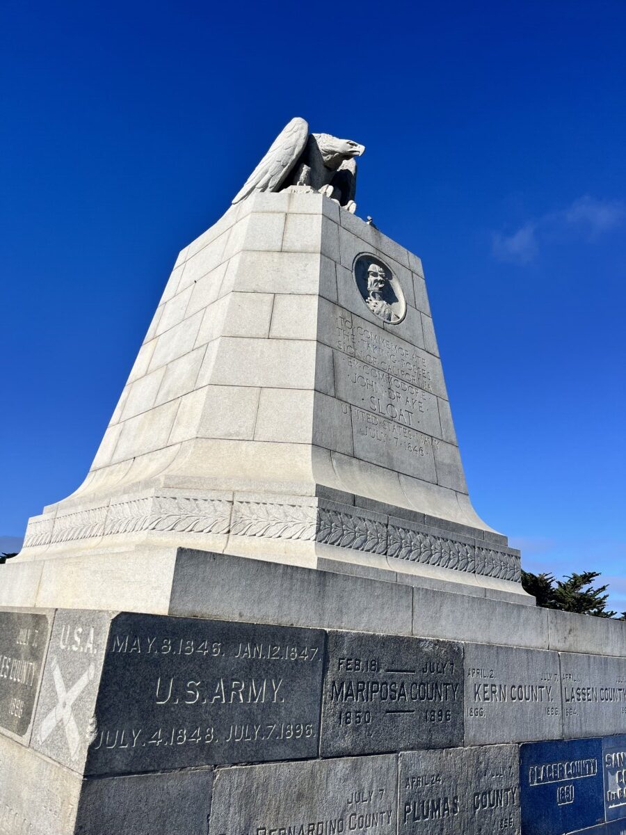 The Sloat Monument, on top of a hill in the Presidio of Monterey, commemorates Commodore Sloat, who took California for the US in 1846. The monument was partly financed with donations from individuals, groups and counties as shown on the base. A typically angry looking eagle guards from the top. Not much else to see since the museum was closed. Grr.