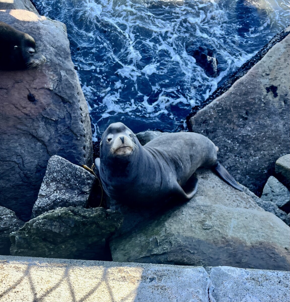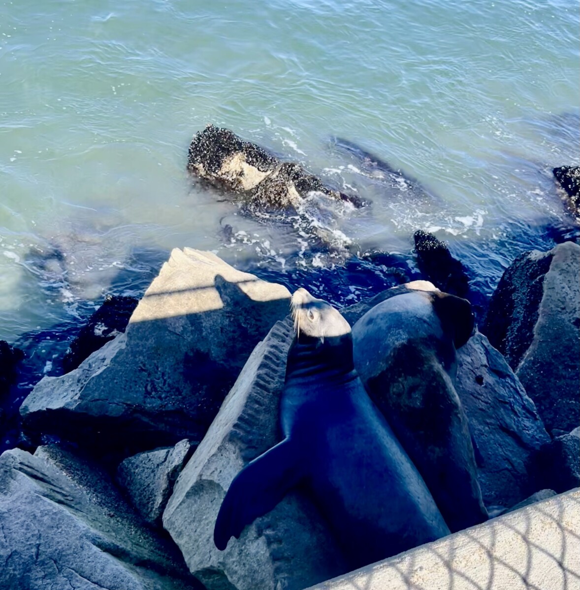 I capped off my expedition with a visit to the Coast Guard Pier to see some sea lions. I already knew they were there because I could hear them barking from the Presidio! They were lounging just a few feet below the wall. Too dark to get myself in the photo with them. Look at that cute face!