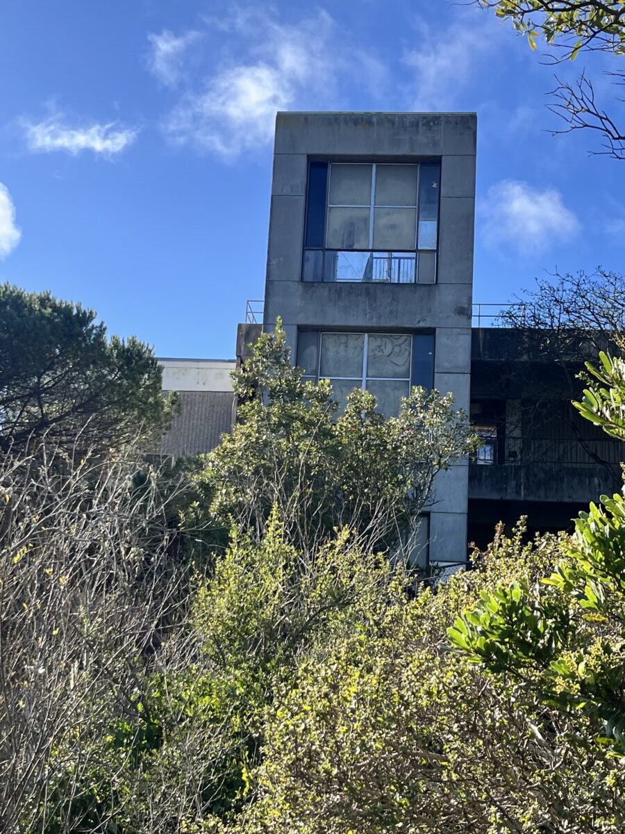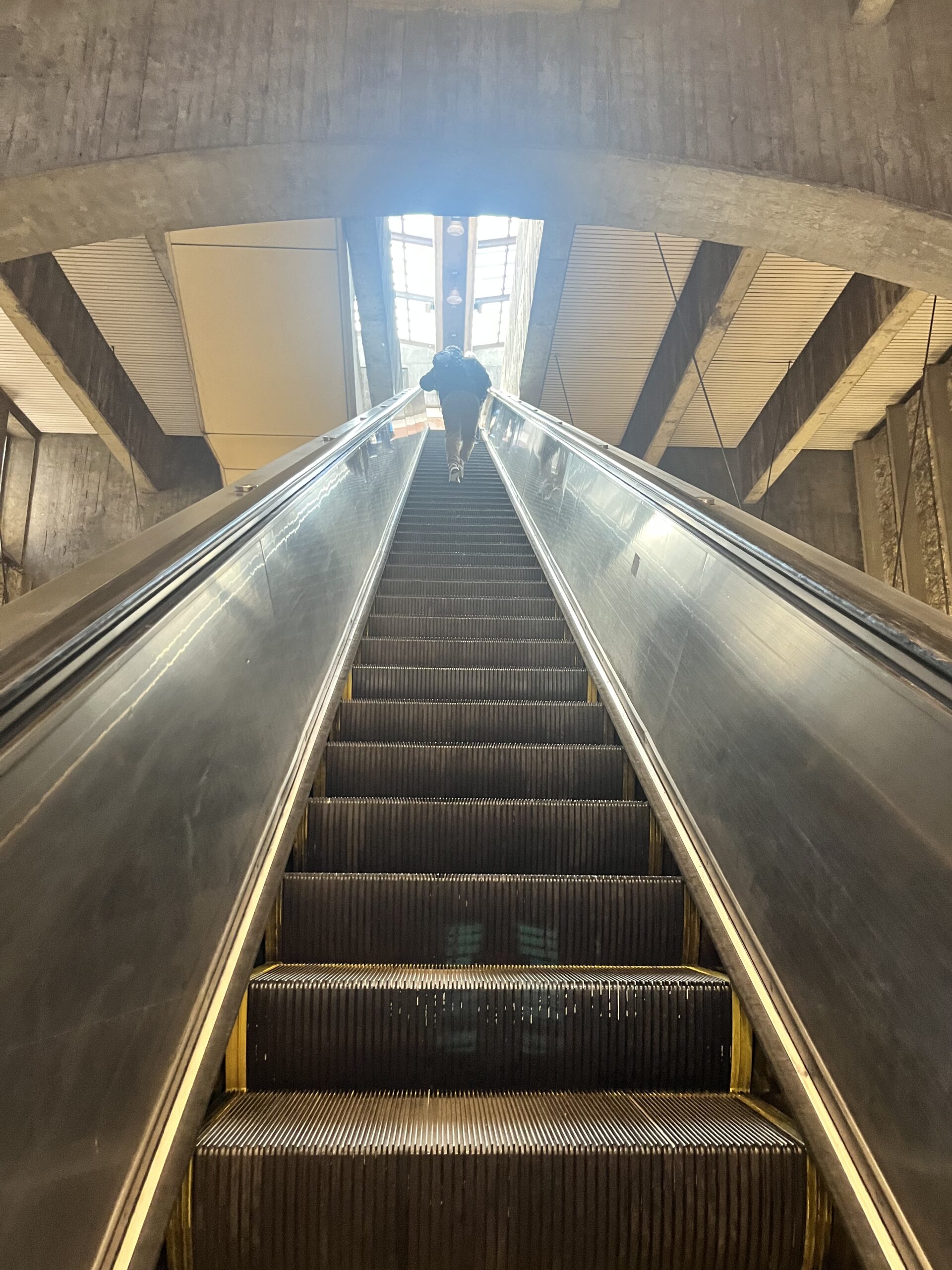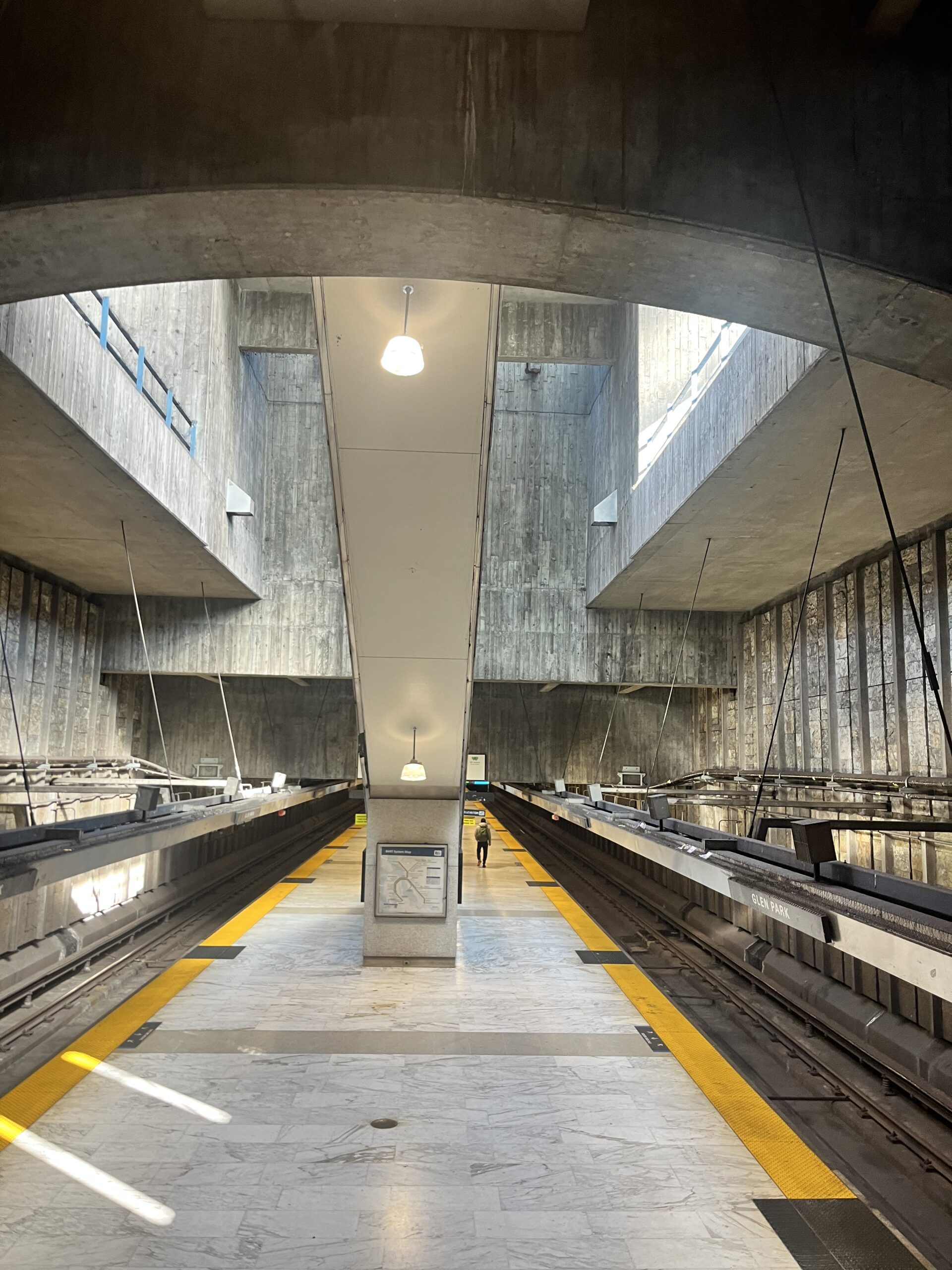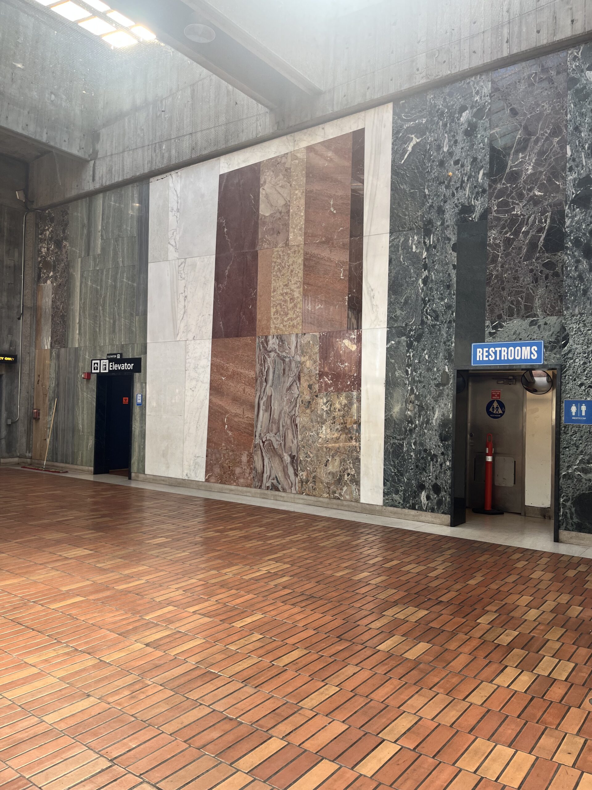 I took BART to the City to start this trail leg at Glen Park. The Brutalist interior is massive volumes of grey concrete walls and white marble floor. The escalator descends dramatically to the platform which is improbably lit by skylights far above. At the entry level is a marble “mural” designed by the station architect Ernest Born. This 1973 building was his last project.