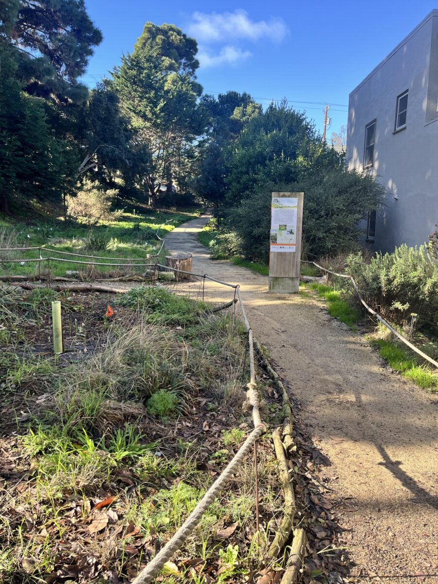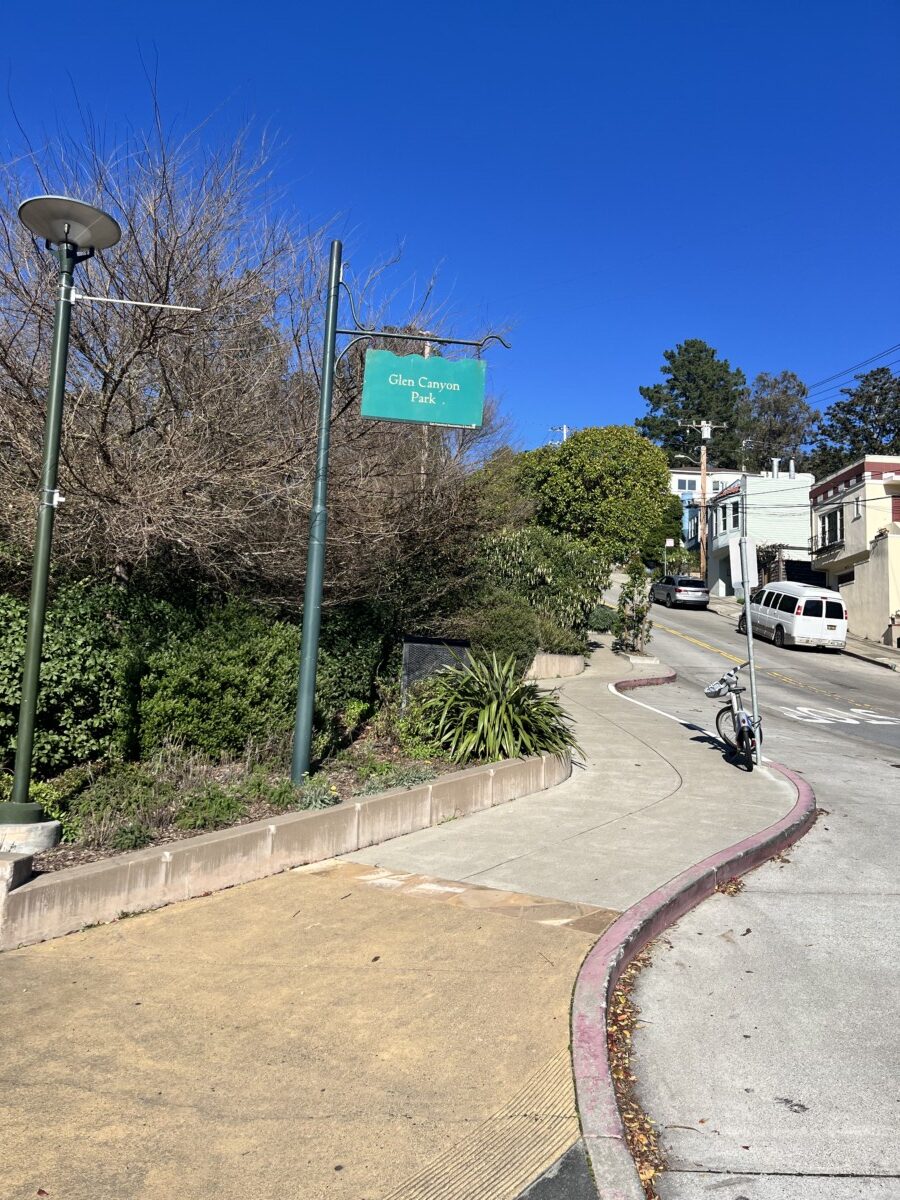 Okay, on to the trail! This section is mostly park rather than urban streets. A few blocks from the BART station, I entered the Woodland section of the Glen Park Greenway, which looks carefully tended by neighbors. The curvy ramp goes over Bosworth Street where traffic heading toward O’Shaughnessy Blvd. starts to speed up.