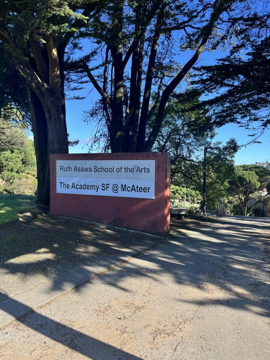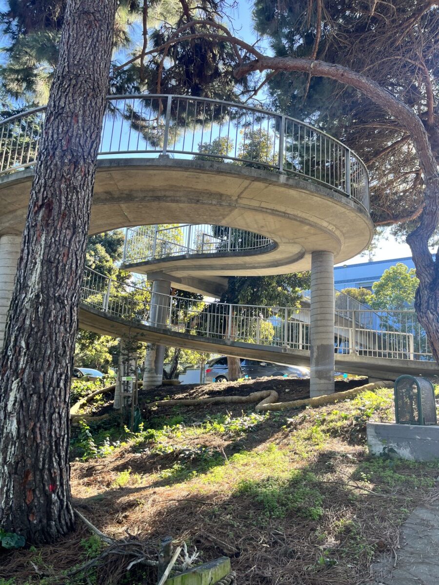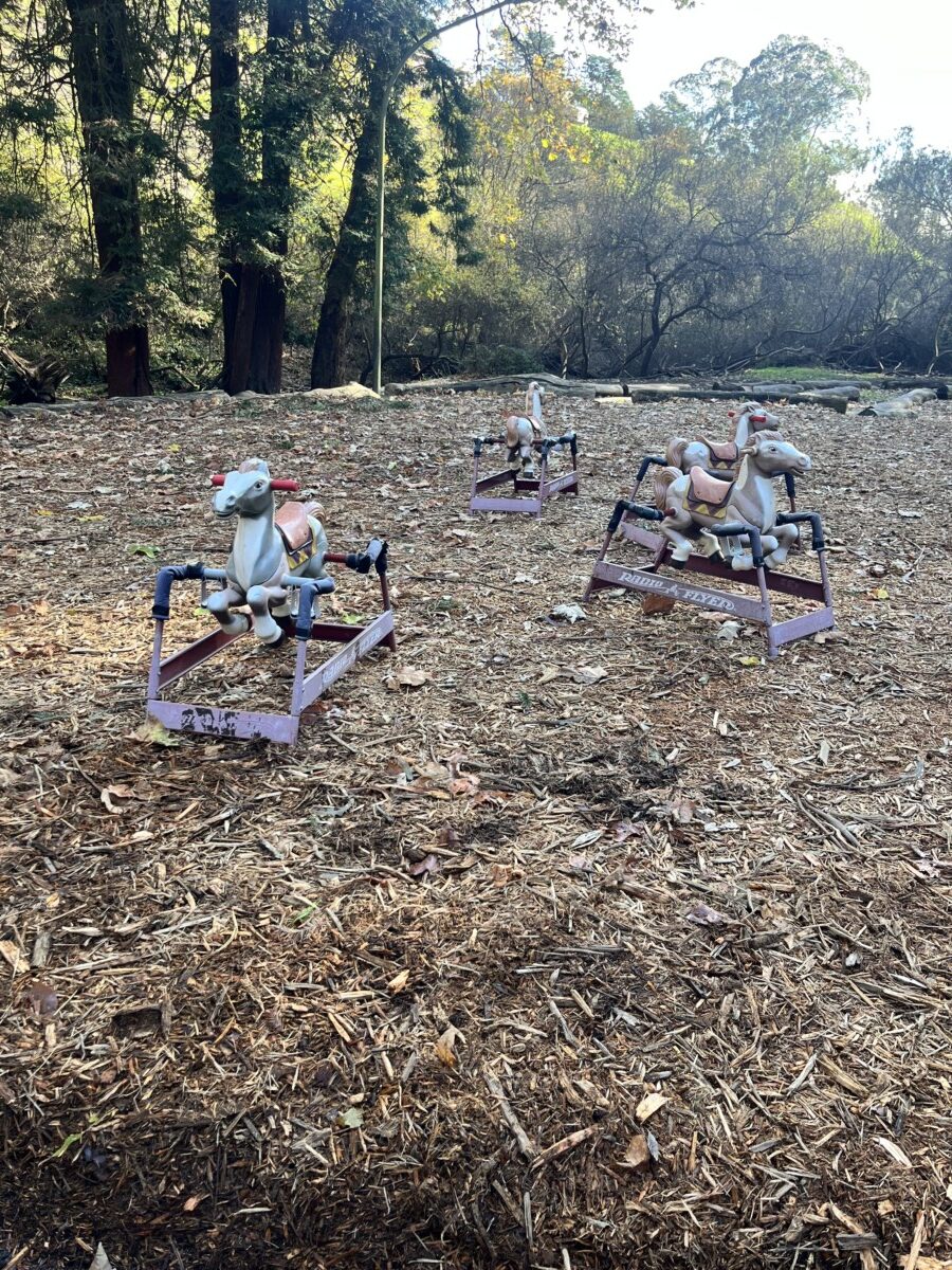 I took the creekside trail toward Portola Avenue, which turned out to be much muddier than I expected. There are several little bridges crossing the water. I was tempted to fish out what I thought was orange trash but then I realized it was a pumpkin! These retro looking rocking horses are outside the Glenridge Cooperative Nursery School. Arriving at Portola Avenue, I found the Ruth Asawa School of the Arts that I learned about at her retrospective last year.
