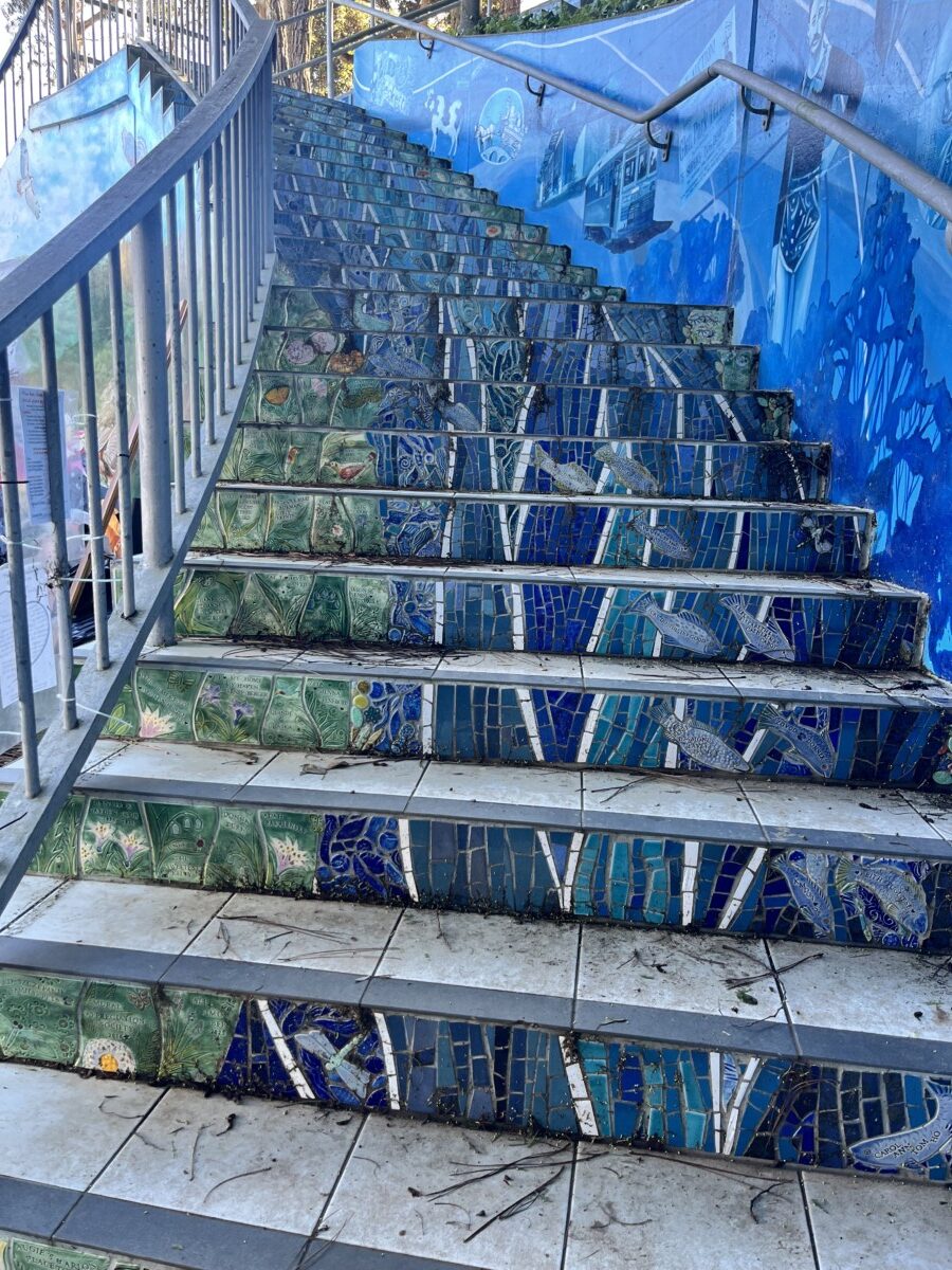 At the end of the Greenway is a single green house, between the path and Bosworth Street. It’s locally famous as the home of Robert Seiwald who will turn 100 this year! He and his wife bought the house in 1960. When the 280 Freeway was built, many homes were moved or destroyed. The catholic school across the street was relocating and wanted to buy their house but didn’t want to pay the asking price. I guess that’s why this cute green house is stranded by itself. It’s not isolated though; the Burnside Mural is right outside, along with the mosaic inlaid steps up to Bosworth.