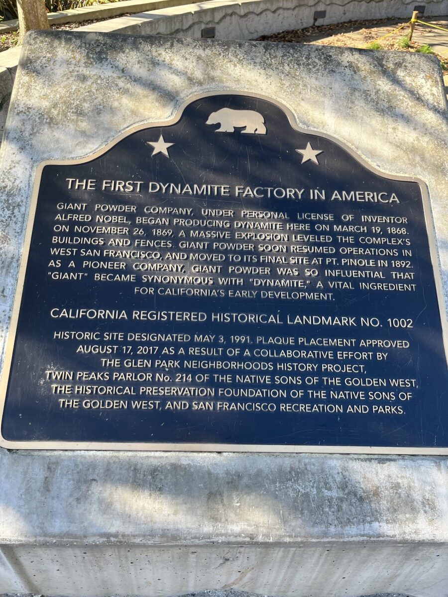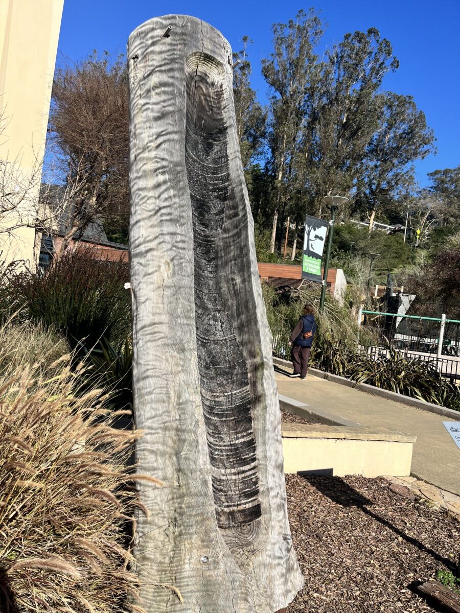 Next I walked a few blocks to the Glen Canyon Park, where I found this plaque commemorating the Giant Dynamite company, which blew up in 1869. The canyon briefly hosted a zoo and park in 1898. Near the Recreation Center building is a sculpture by Charles Sowers. The lines inside the tree trunks were created by focusing sunlight into a narrow beam to burn the wood. I really like Sowers’ work. I encountered another piece during Expedition #1 outside the Randall Museum.