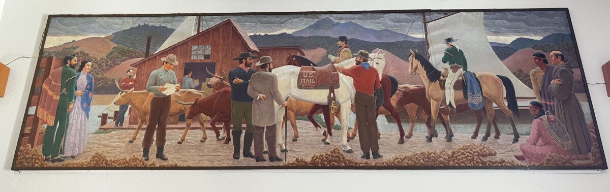 This expedition satisfied three top interests of mine: WPA art, weird museums and cool architecture. My first stop was the downtown San Rafael post office. It’s a basic looking Spanish style building with vaguely Mayan Revival window grates. Inside is a lovely mural titled “San Rafael Creek—1851” (1937) that looks like it was painted last week. I couldn’t find info about whether it’s been restored.