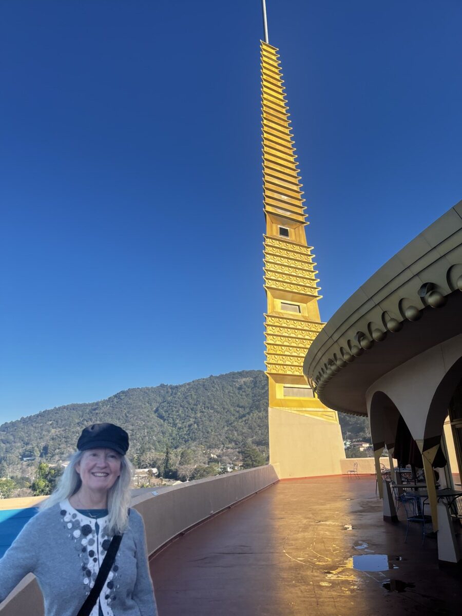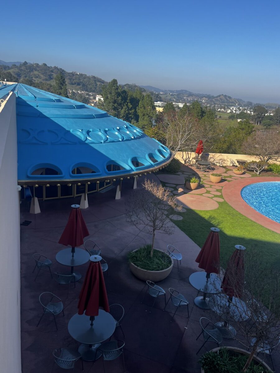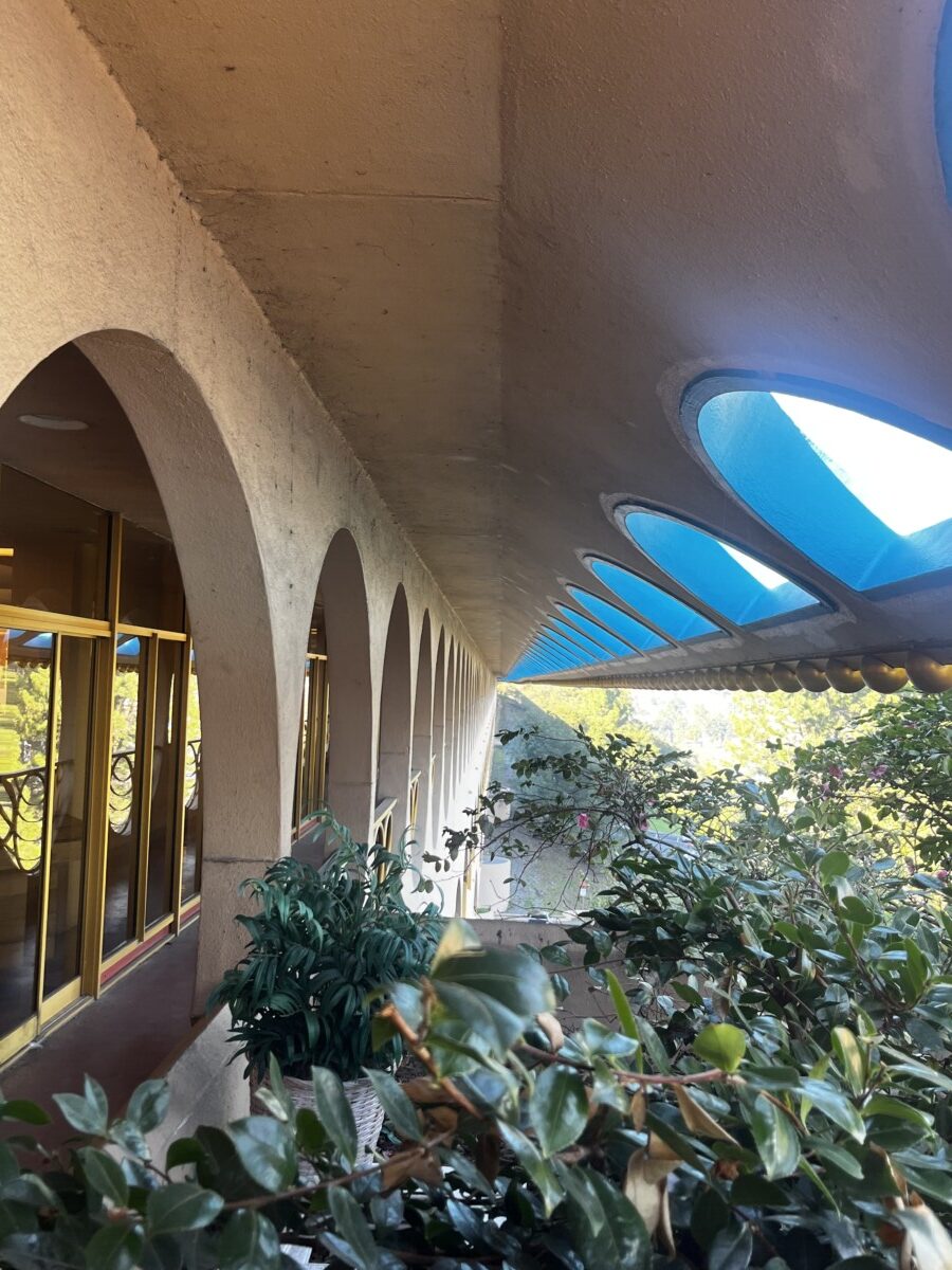 Stop three was the Marin County Civic Center, designed by Frank Lloyd Wright and completed in 1962, two years after his death (it was his last commission). Other buildings and structures were completed in the 70’s. The building has an open sunlit feeling because it actually is open. Entry is through openwork metal gates, not doors. Originally there was no roof but weather issues quickly dictated adding one. This openness symbolized Wright’s belief that government should be transparent.
