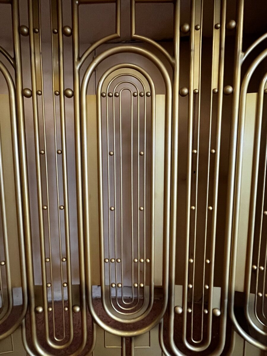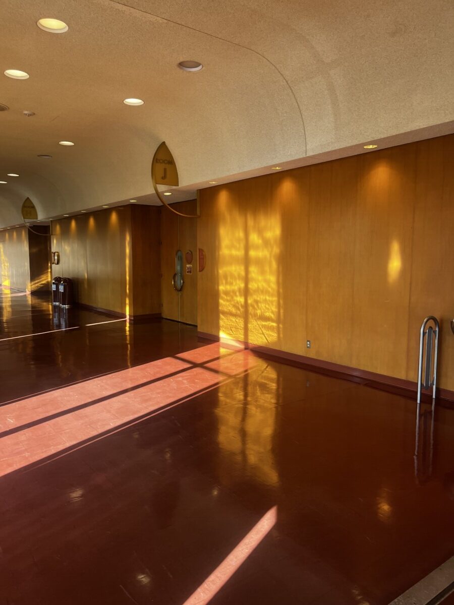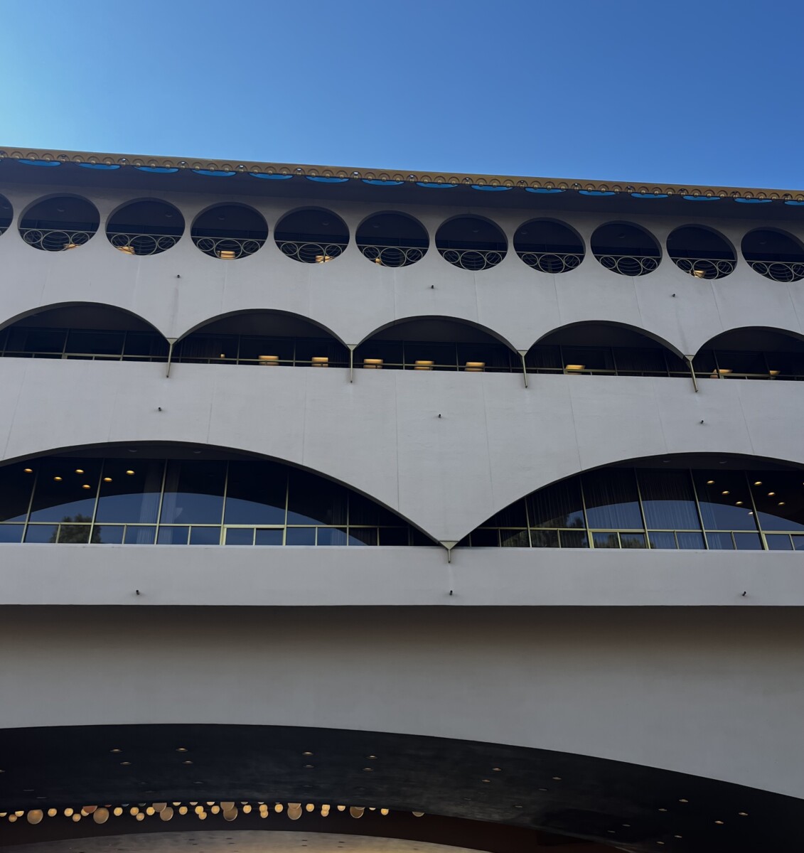 Stop three was the Marin County Civic Center, designed by Frank Lloyd Wright and completed in 1962, two years after his death (it was his last commission). Other buildings and structures were completed in the 70’s. The building has an open sunlit feeling because it actually is open. Entry is through openwork metal gates, not doors. Originally there was no roof but weather issues quickly dictated adding one. This openness symbolized Wright’s belief that government should be transparent.