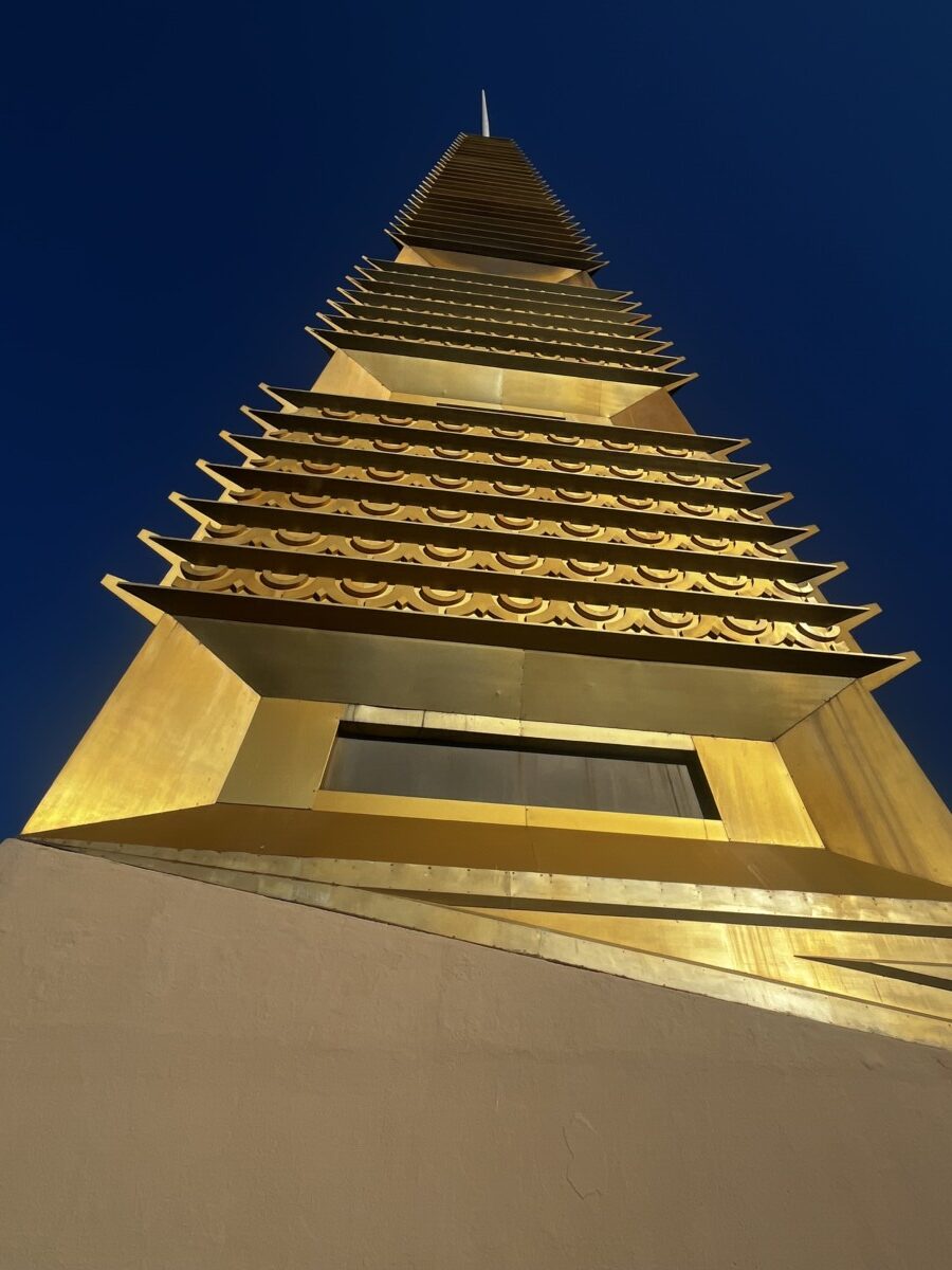 I went on the guided tour. We stopped at a hill at the southern end of the building that the guide said was the place Wright declared he would set the building among the three hills. Other proposals suggested flattening the hills. The roof was designed to be gold, to blend with the golden hills around it but it wasn’t feasible. I think the blue is beautiful. He did get a gold tower though.