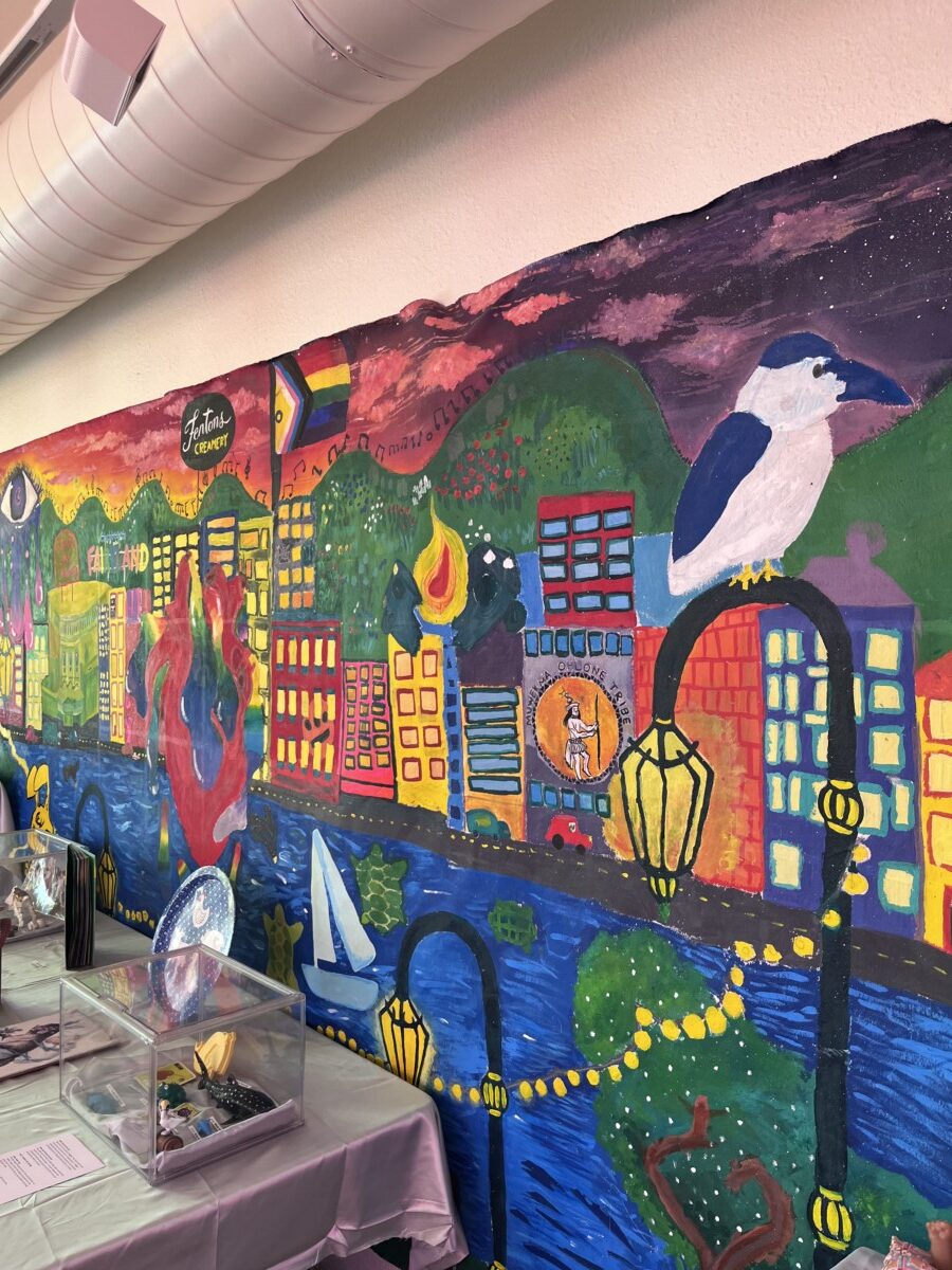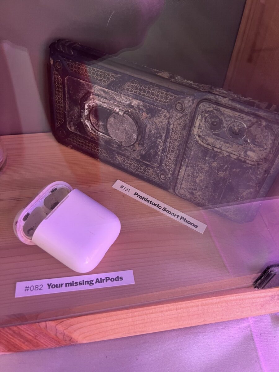 Other descriptions speculate on items tossed angrily into the lake for some reason, like ID badges of disgruntled employees. Many of the item titles are equally funny, like “Your Missing AirPods” and “Gasket of Destiny.” You can read all the hilarious back stories on the website here. The exhibit is at the Junior Center for Art and Science which includes this cute mural of the lake. It’s open till March 6, 2026.