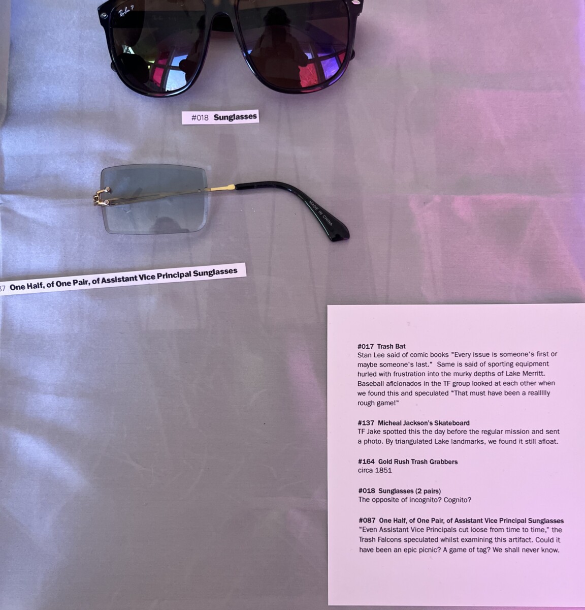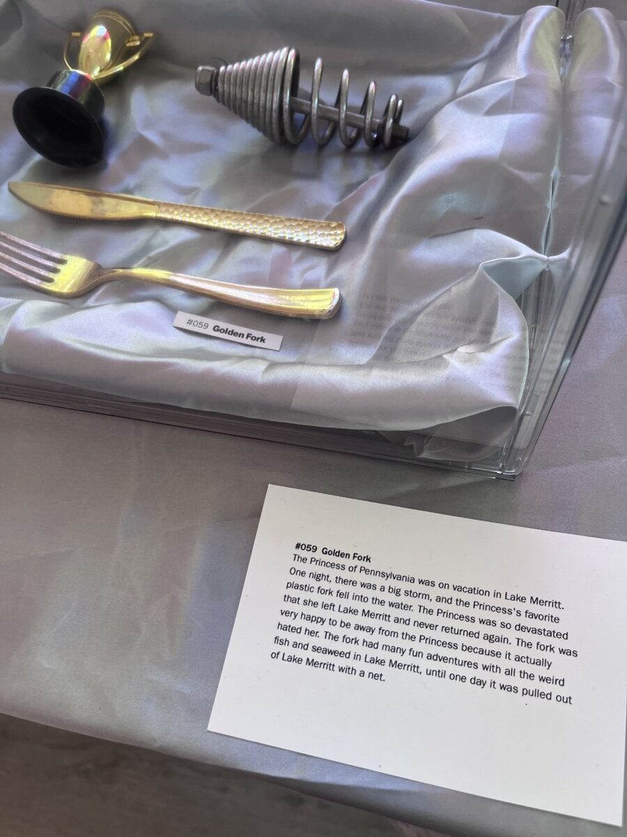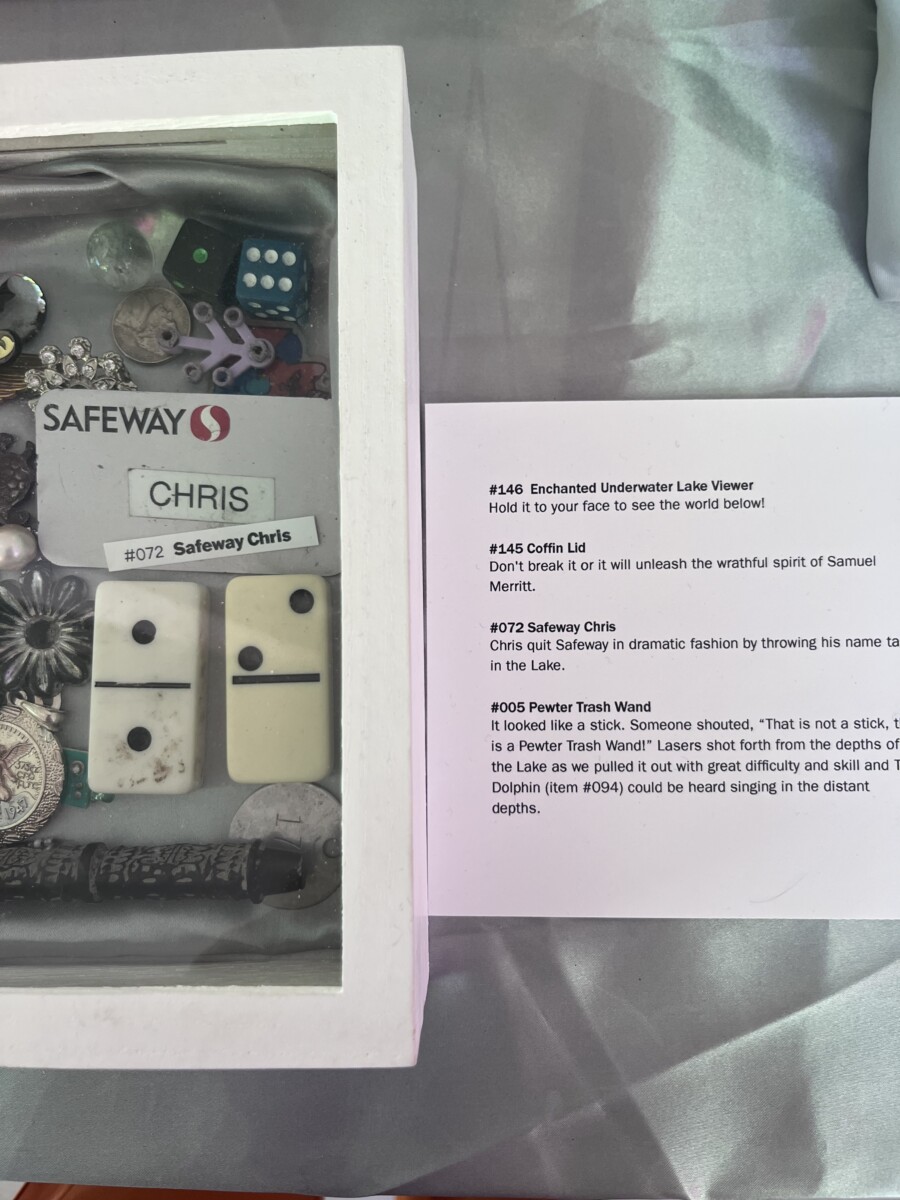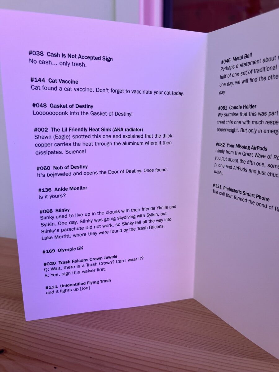 Some of the trash art is pieces created from found items. But most is the items themselves. The art is the fanciful and amusing descriptions they’ve written for each item. Here’s the description of a found Slinky: “Slinky used to live up in the clouds with its friends Yknils and Sylkin. One day, Slinky was going skydiving with Sylkin, but Slinky’s parachute did not work, so Slinky fell all the way into Lake Merrit, where they were found by the Trash Falcons.”