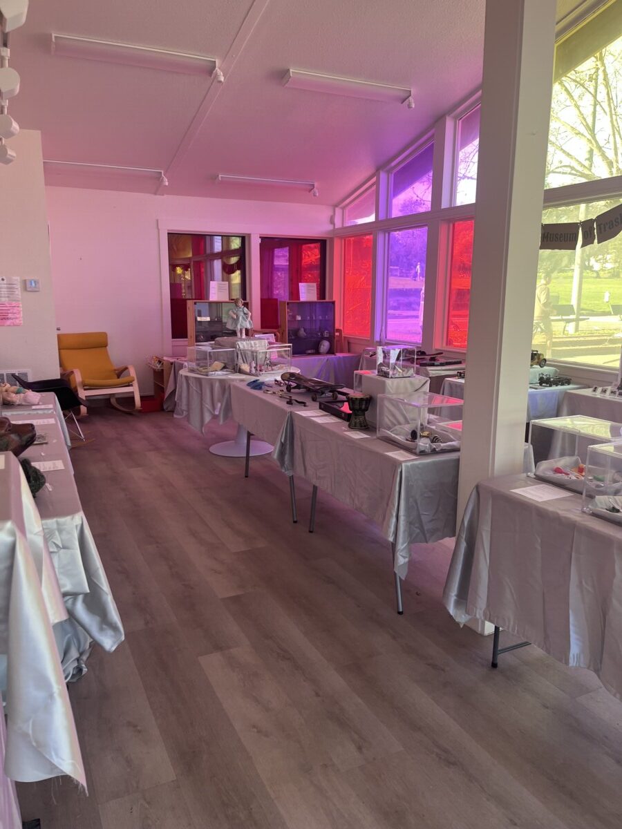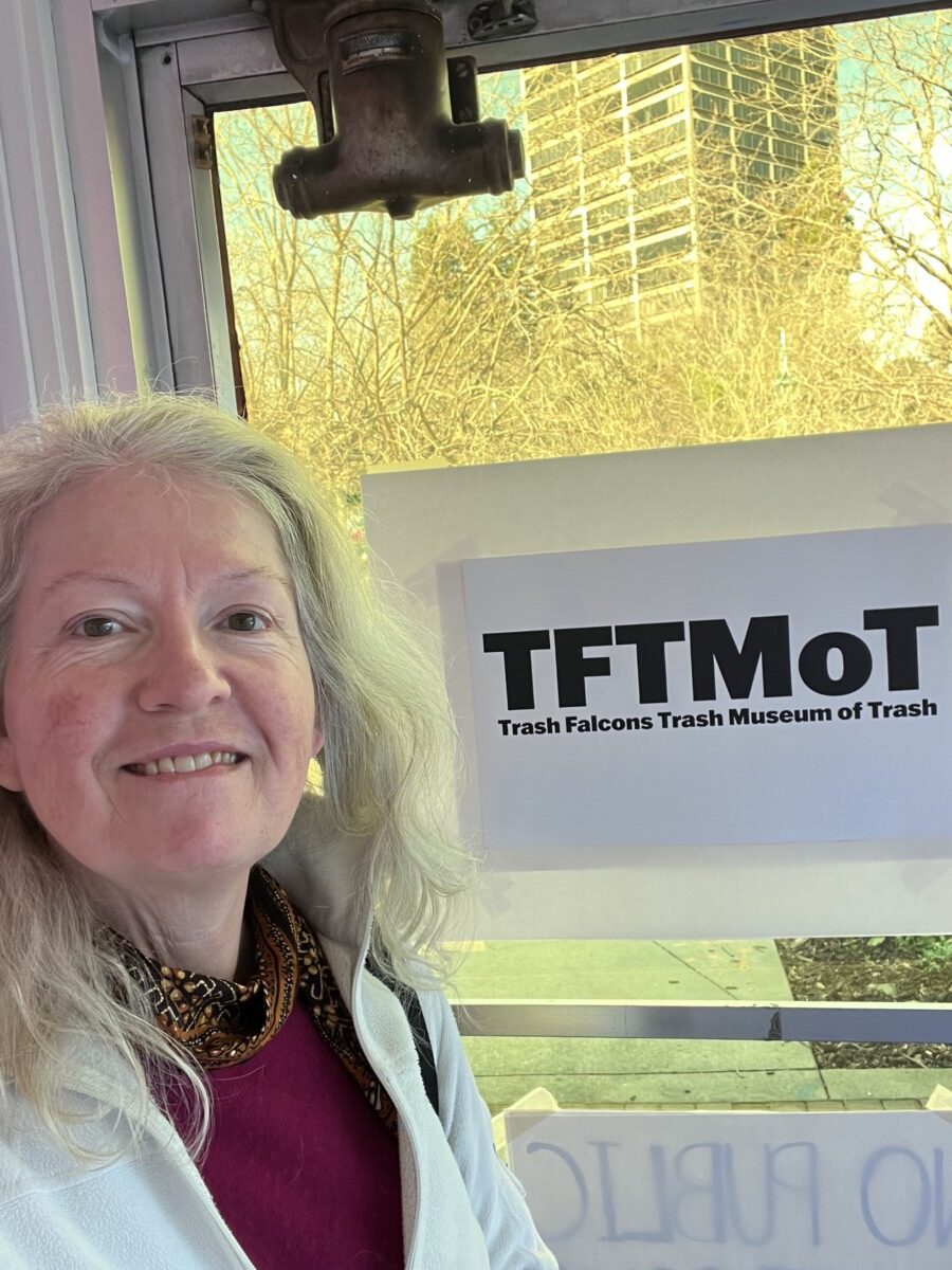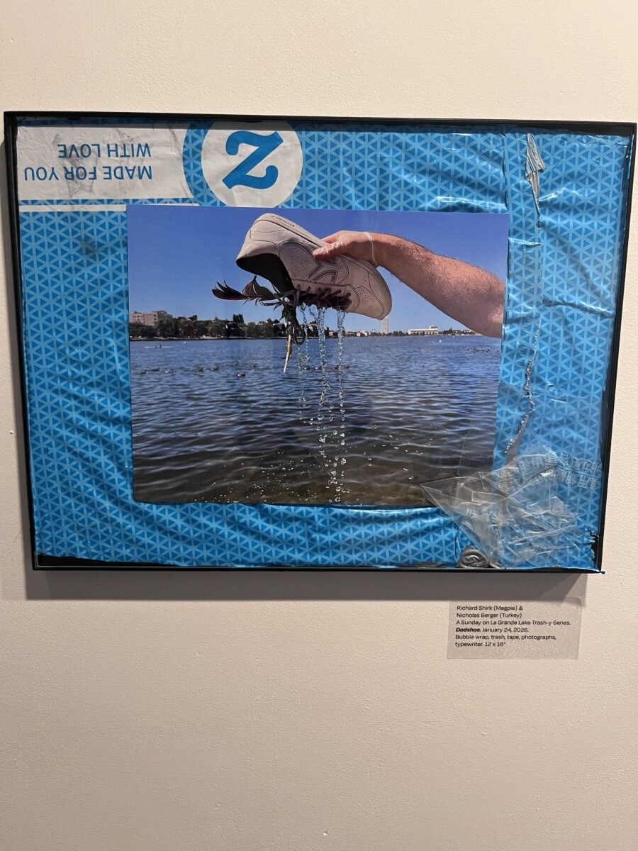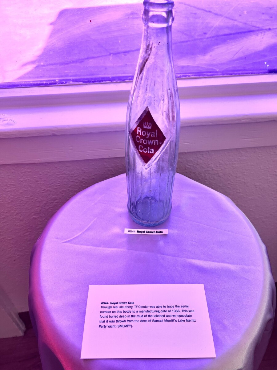 Some of the trash art is pieces created from found items. But most is the items themselves. The art is the fanciful and amusing descriptions they’ve written for each item. Here’s the description of a found Slinky: “Slinky used to live up in the clouds with its friends Yknils and Sylkin. One day, Slinky was going skydiving with Sylkin, but Slinky’s parachute did not work, so Slinky fell all the way into Lake Merrit, where they were found by the Trash Falcons.”