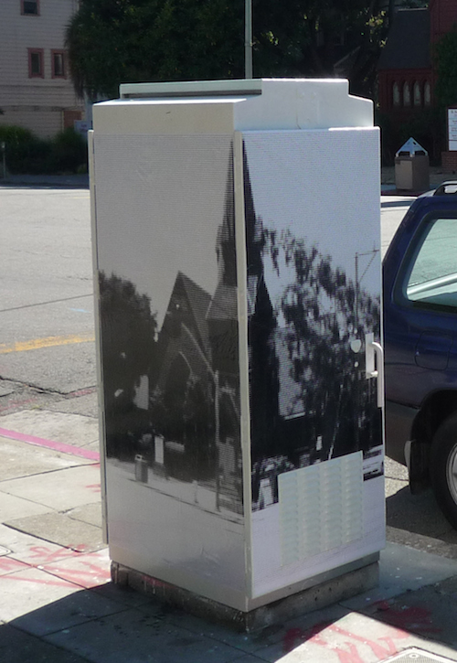 The photos on the box are of the view beyond the box. They were rasterized to make them a bit abstract, and so that viewers would need to really look to see what they depict. The rasterizing also means that if the viewer is too close, the image is hard to recognize. I wanted to encourage passersby to take some time and notice what’s there and all around them.