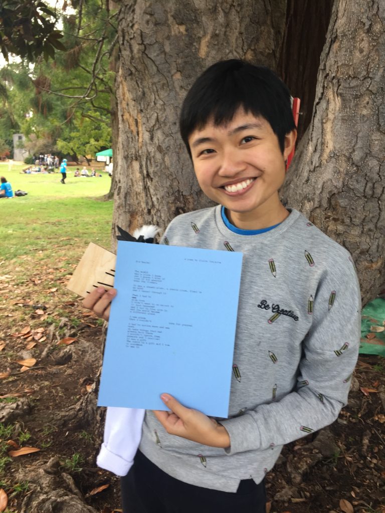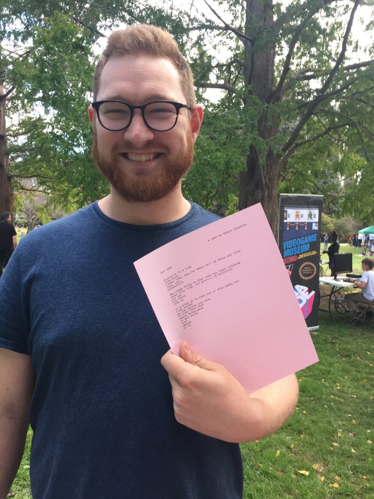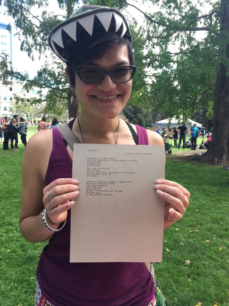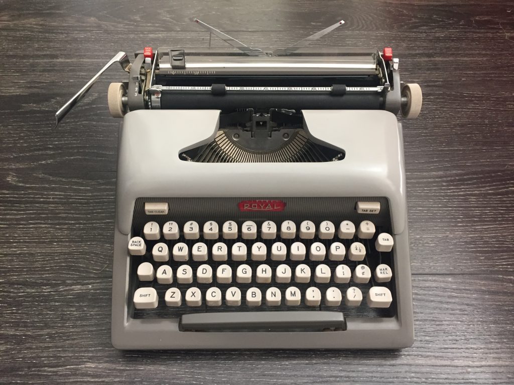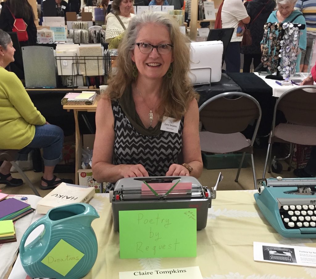 I write poems by request on my Smith-Corona Corsair Deluxe or my Royal Futura 800. I have a conversation with each person and find out what they would like a poem about and I write it on the spot.